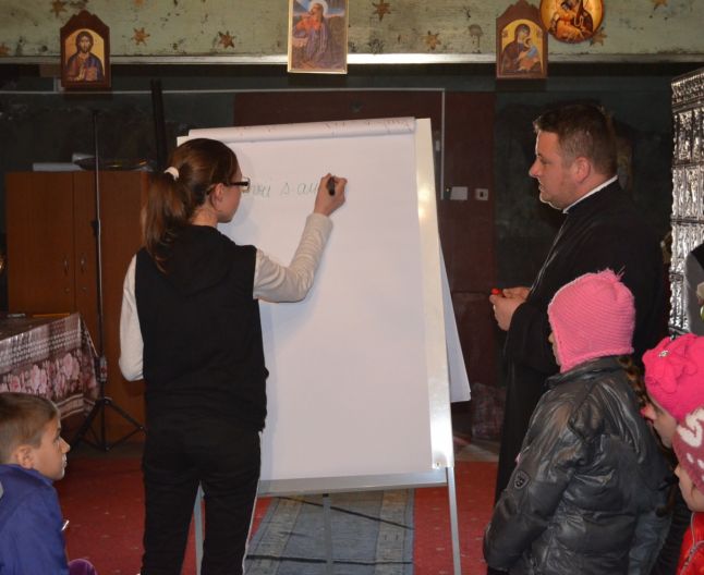 The girl, who is studying at the Alexandru Ioan Cuza national college in Alexandria travels every weekend to a village to help children in social centers learn English. The centers are coordinated by Bogdan and Florin Danu, two priests who work in two different churches in two different locations.