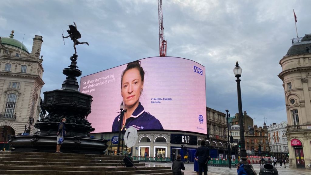 A Romanian midwife has become the image of the National Health Service in the UK and her photograph has been featured all over the country on bus stops and billboards.